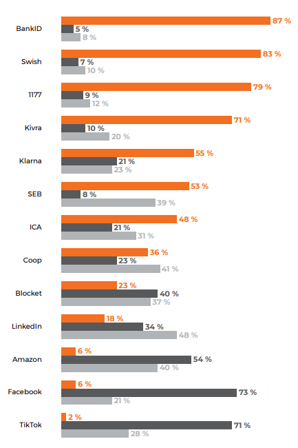 87 procent av respondenter ser BankID som den säkraste tjänsten, följt av Swish (83) och 1177 (79). De svarande säger sig ha minst förtroende för Facebook och TikTok med 73 respektive 71 procent.