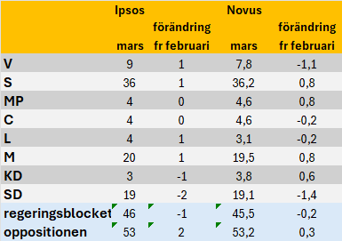Novus genomförde sin mätning 19 februari – 17 mars 2024. Ipsos genomförde sin mätning 12–24 mars 2024. Båda mätningarna visar att både Socialdemokraterna och Moderaterna ökar med runt en procentenhet jämfört med mätningen i februari. Sverigedemokraterna minskar med 1,4-2 procentenheter. De största avvikelserna mellan de två mätningarna återfinns hos Vänsterpartier som enligt Ipsos ökar med 1 procentenhet medan partiet minskar motsvarande hos Novus. Liberalerna ökar med en procentenhet hos Ipsos men minskar hos Novus. Kristdemokraterna minskar hos Ipsos men ökar hos Novus.