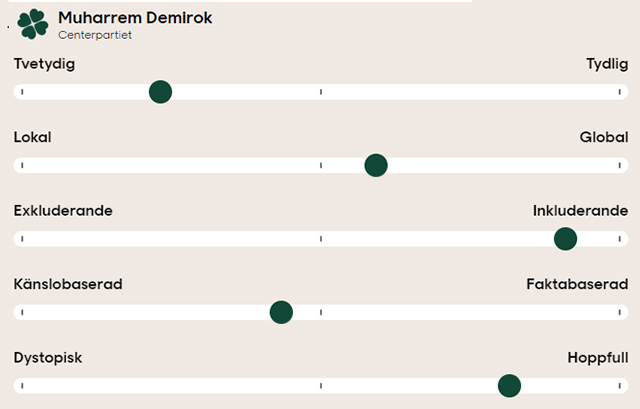 Enligt Eidras realtidsanalys använde Muharrem Demirok 12,6 ord per mening. Han använde 32 unika ord av 100. Muharrem Demirok bjöd på 11 valfläsk och använde 47 floskler, enligt den ai-baserade analysen.